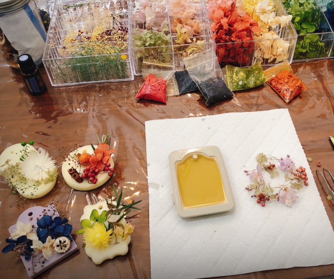 火のゆらめきと部屋中に広がアロマの香りに癒されるキャンドルとサシェの両方を作成できます。